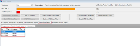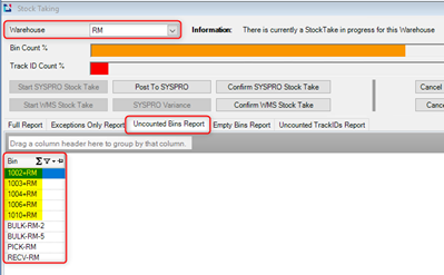 Another critical report to look at is the Uncounted Bin Reports. This report ensures comprehensive coverage by listing all uncounted bins within the selected warehouse and confirms that the Count Team has visited every bin. This list can include Picking Bins (which match the pick slip number for any pick slips in a STARTED status and picking is still in progress. Typically, all pick slips must be completed before any stock take starts, but if there are pick slips in progress, you can count them as part of the current count so that the stock is not adjusted out when you confirm the count.